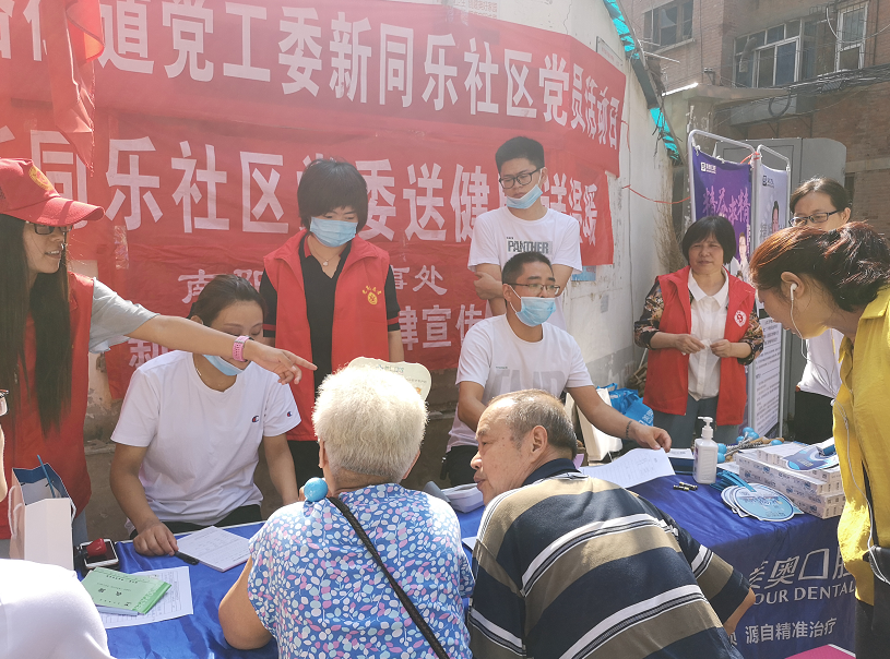 本网讯 (记者 魏健 通讯员 霍梦瑶 郑州报道)8月15日,新同乐社区迎来了本月的党员活动日,为了充分发挥党员的先锋模范作用,进一步提高党员的志愿奉献精神,更好地服务辖区党员群众,新同乐社区党委联合比邻社工,开展“送温暖送健康”口腔义诊和宣传特色党日活动。 一大早,新同乐社区的党员志愿者和社工就来到社区义诊活动现场,拉横幅、搬器材、布置活动场地,引导居民自觉排队、做好登记准备工作。义诊过程中,郑州美奥口腔医务人员为每一个前来义诊的居民进行了认真地检查,细致地告知他们的口腔健康状况,提出了指导性的建议。同时,宣传口腔卫生常识,告知大家要养成健康的饮食卫生习惯和科学的养生方式。